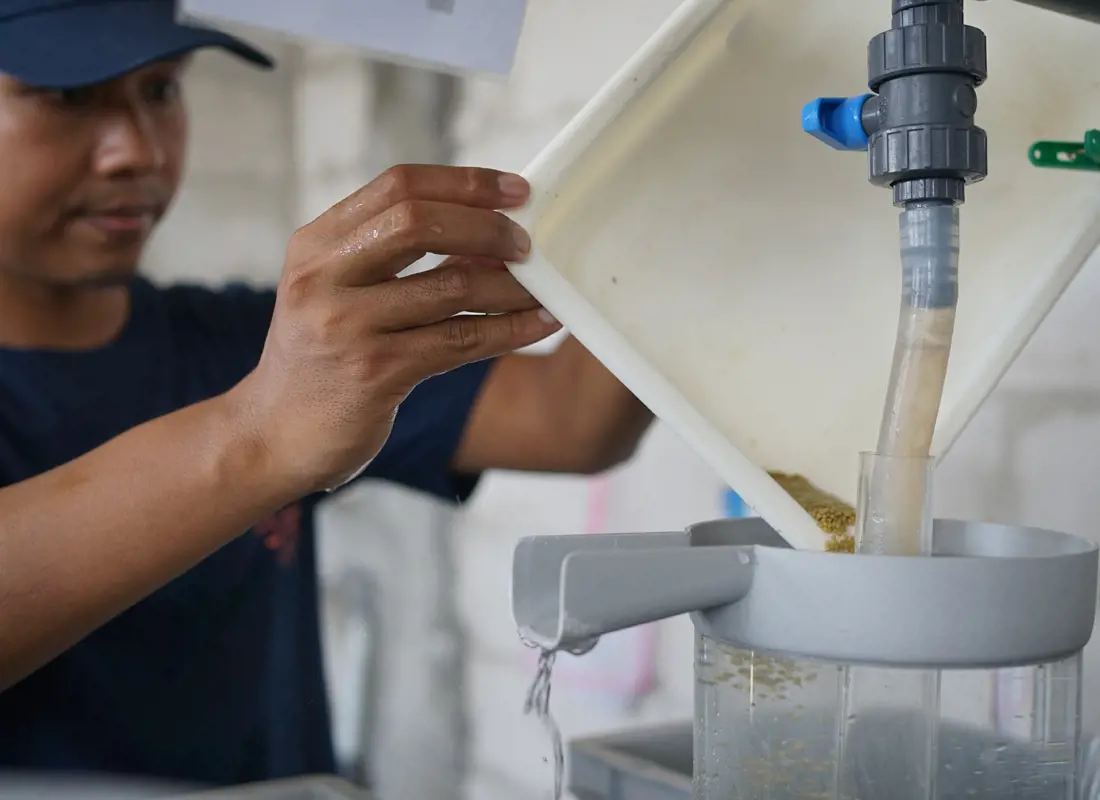 Budi: "Esses alevinos NMT também são mais uniformes em tamanho do que os peixes tratados com hormônios. Em um viveiro de tilápia, normalmente você espera até que os alevinos flutuem na superfície do tanque e os colete após cerca de 18 dias, independentemente da idade deles. Com os alevinos NMT, podemos coletar os ovos a cada 10 dias, classificá-los em quatro grupos com base no estágio de desenvolvimento e garantir que sejam uniformes em tamanho. Isso também beneficia os piscicultores. Não é possível fazer isso com peixes tratados com hormônios."