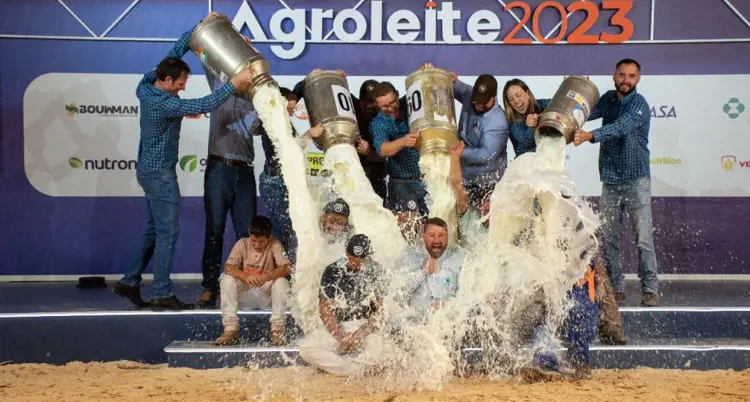 Após o anúncio dos vencedores, a Arena Agroleite recebeu o tradicional banho de leite – momento em que os criadores que venceram nas categorias são banhados com parte do leite ordenhado.
