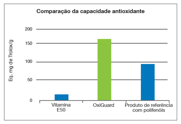 Realizamos testes in-vitro e in vivo comparando a capacidade antioxidante da Vitamina E50, do OxiGuard e de um produto de referência à base de polifenóis. OxiGuard apresentou propriedades antioxidantes robustas, garantindo as maiores margens de segurança para uma capacidade antioxidante eficiente e ideal.